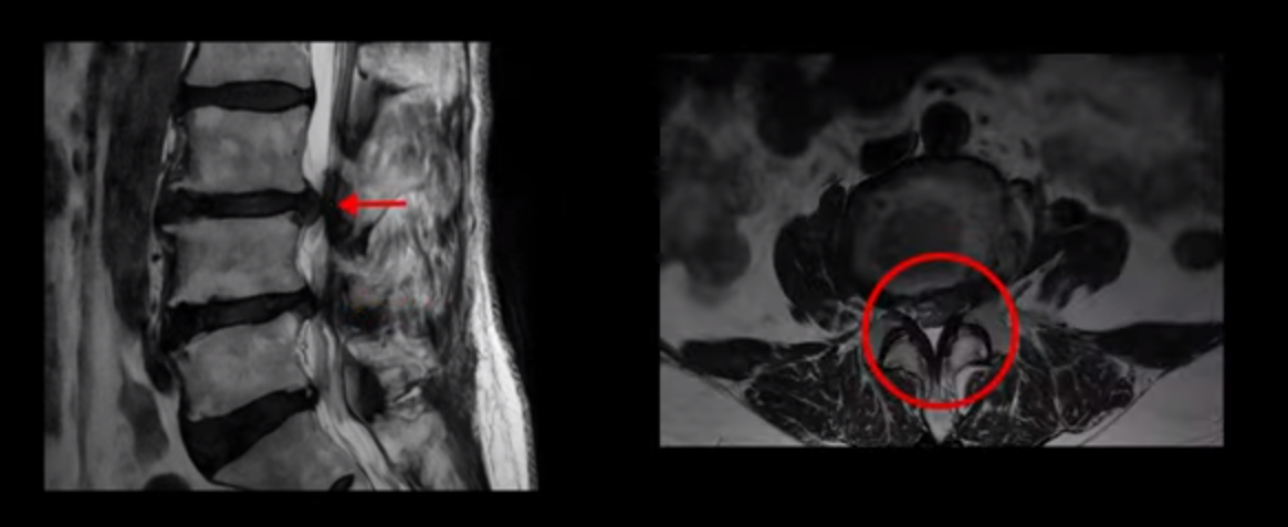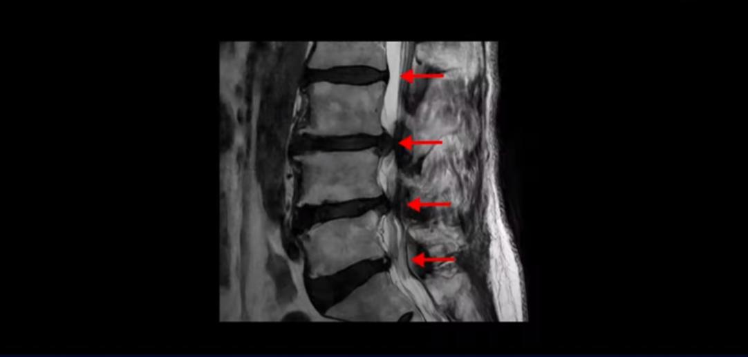 이분은 허리부터 다리, 복숭아뼈까지 극심하게 저리고 아픈 분입니다. MRI를 보시면 허리 4마디가 안 좋습니다.
