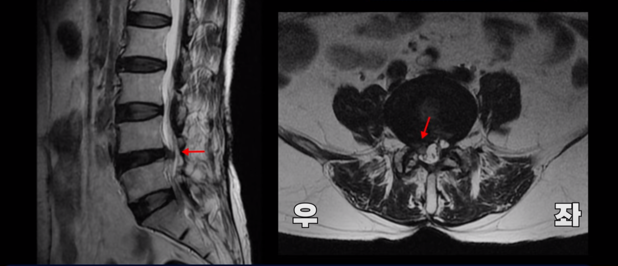 그래서 이분은 오른쪽 엉덩이와 오른쪽 다리에 심한 방사통이 있으셨습니다.
