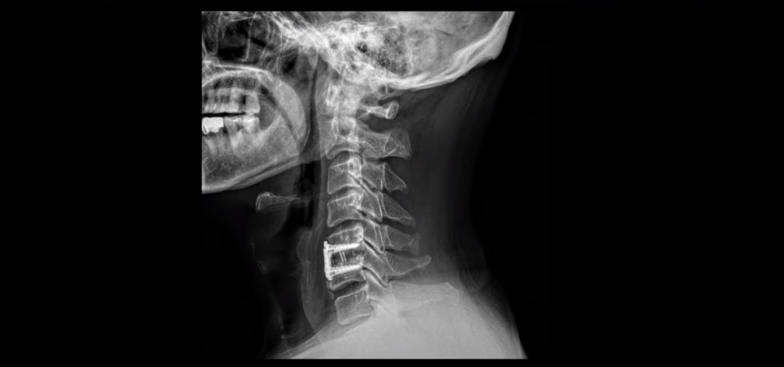 MRI를 보시면 목 5번 6번 마디에 나사가 박힌 유합술이 되어있습니다.