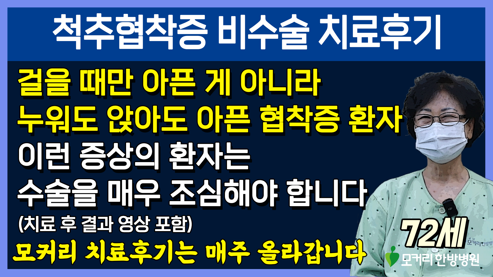 협착증 환자분들 중 걸을 때만 다리가 저리고 아픈 분들이 있고, 반면에 앉거나 누울 때도 허리, 엉덩이, 다리가 아프고 저린 분들이 있습니다. 이 환자분처럼 앉아도 누워도 아픈 분들일수록 근육 문제가 심한 분들이고, 이런 분들은 걸을 때만 아픈 분들에 비해 수술 결과도 더 안 좋고 따라서 수술 이후에도 아플 가능성이 높습니다. 꼭 알아두시길 바랍니다. 저희 모커리한방병원에서는 걸을 때만 다리가 저리고 아픈 분들을 단순형 협착증, 걸을 때 말고도 앉거나 누울 때도 허리, 엉덩이와 다리가 저리고 아픈 분들을 복합형 협착증이라고 부르는데, 이 환자분이 바로 복합형 협착증 환자분입니다.