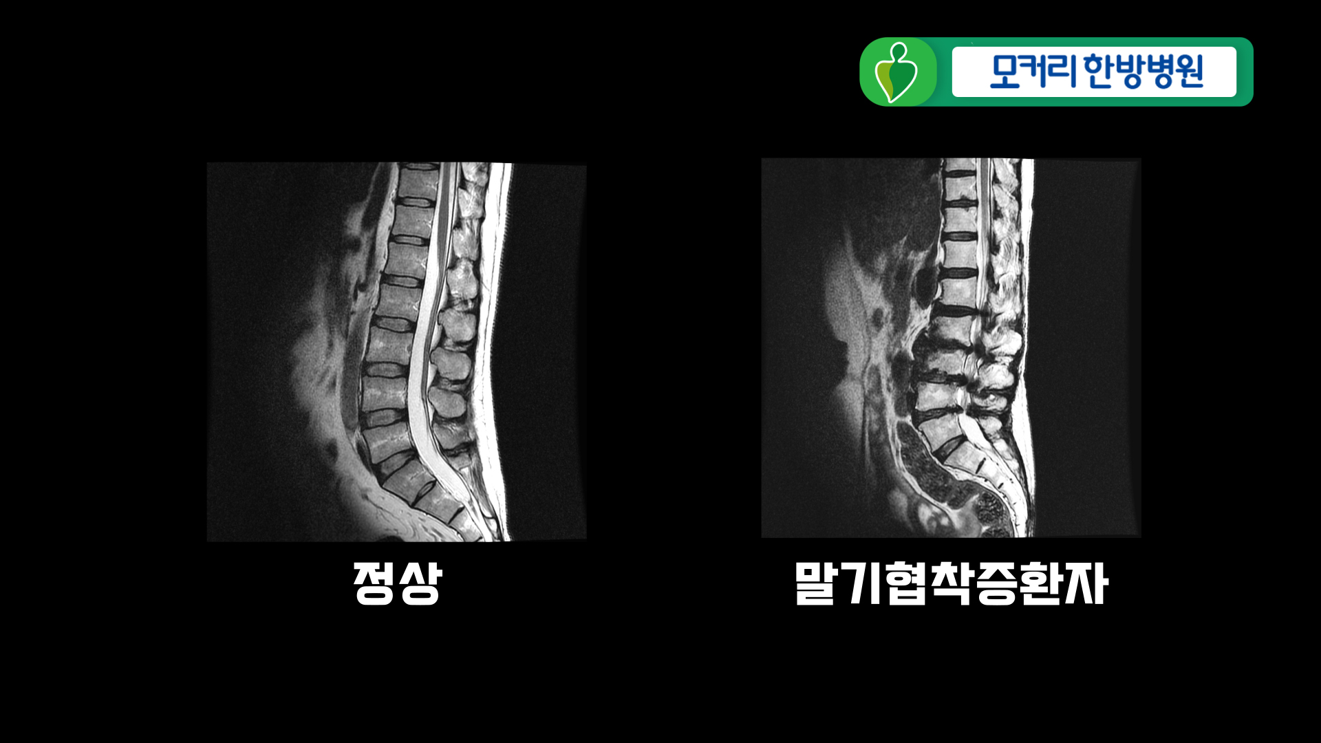 척추를 옆에서 바라본 MRI 사진입니다. 왼쪽은 정상 척추, 오른쪽은 협착증 환자의 척추 MRI 사진입니다. 협착증 환자는 허리 전체 마디가 퇴행되어 있습니다.