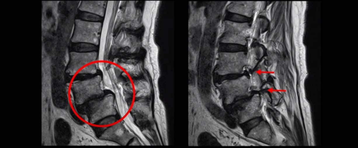 아예 신경이 보이지 않을 정도입니다. 그런데 이분은 이렇게 협착이 심해 보여도 작년 가을까지 아무런 증상이 없었습니다. 협착증의 시작은 가을에 해외여행을 가서 장시간 차량을 타고 이동한 이후 극심한 다리통증과 저림 증상이 발생했습니다. 해외여행으로 허리에 무리가 된 후 허리 근육에 문제가 생기니까 신경 눌림 증상이 시작된 겁니다. MRI로 협착이 심해 신경이 눌려 보이지만 그동안 아무런 증상 없이 잘 살았다는 말은 근육신경재활치료로 근육의 상태를 개선해주면 다시 안 아팠던 상태로 돌아갈 수 있다는 얘기입니다.