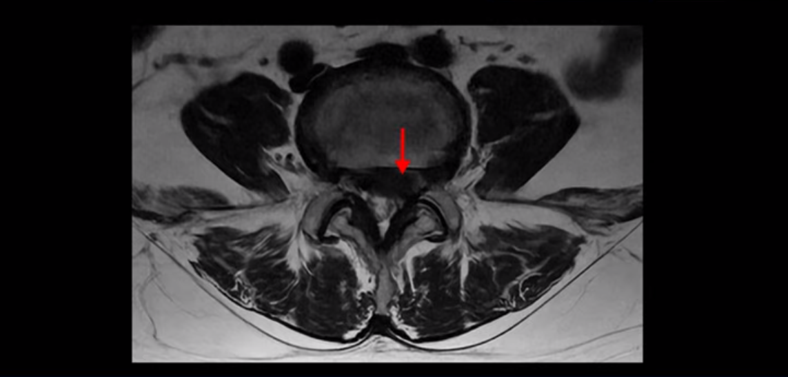 이분의 MRI를 환자 증상은 자세히 듣지 않고 MRI만 보고 진료하는 의사가 본다면 심한 디스크 파열이 보이기 때문에 그냥 디스크 파열 증상이라고 진단할 겁니다. 하지만 이분의 증상은 명확히 디스크 탈출 증상이 아니고 협착증 증상입니다. 급성 디스크 증상이라면 재채기도 못하고 조금만 허리를 구부려도 날카로운 통증이 발생할 텐데, 그런 증상이 아닙니다. 진단을 잘못하면 엉뚱한 치료를 하게 되고 당연히 치료 결과가 좋을 수가 없습니다. 그래서 밀려 나온 디스크와 협착이 같이 보일 때는 증상으로 질환을 감별하는 것이 매우 중요합니다. 오래되어 굳어버린 디스크 수핵도 신경을 좁히는 역할을 하니까 협착증 증상을 일으키는 것이죠.