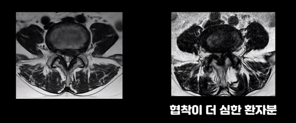 이렇게 신경 공간이 좁아진 것을 협착이라고 합니다. 왼쪽으로 신경 구멍이 더 좁아져 있으니까 처음에는 왼쪽 엉덩이와 다리가 아팠는데 몇 년 동안 주사 맞으면서 버티다 보니까 오른쪽 다리까지 아프게 됩니다. 결국 양쪽 다리가 너무 아파서 5분 걷기도 힘들어지게 됩니다.