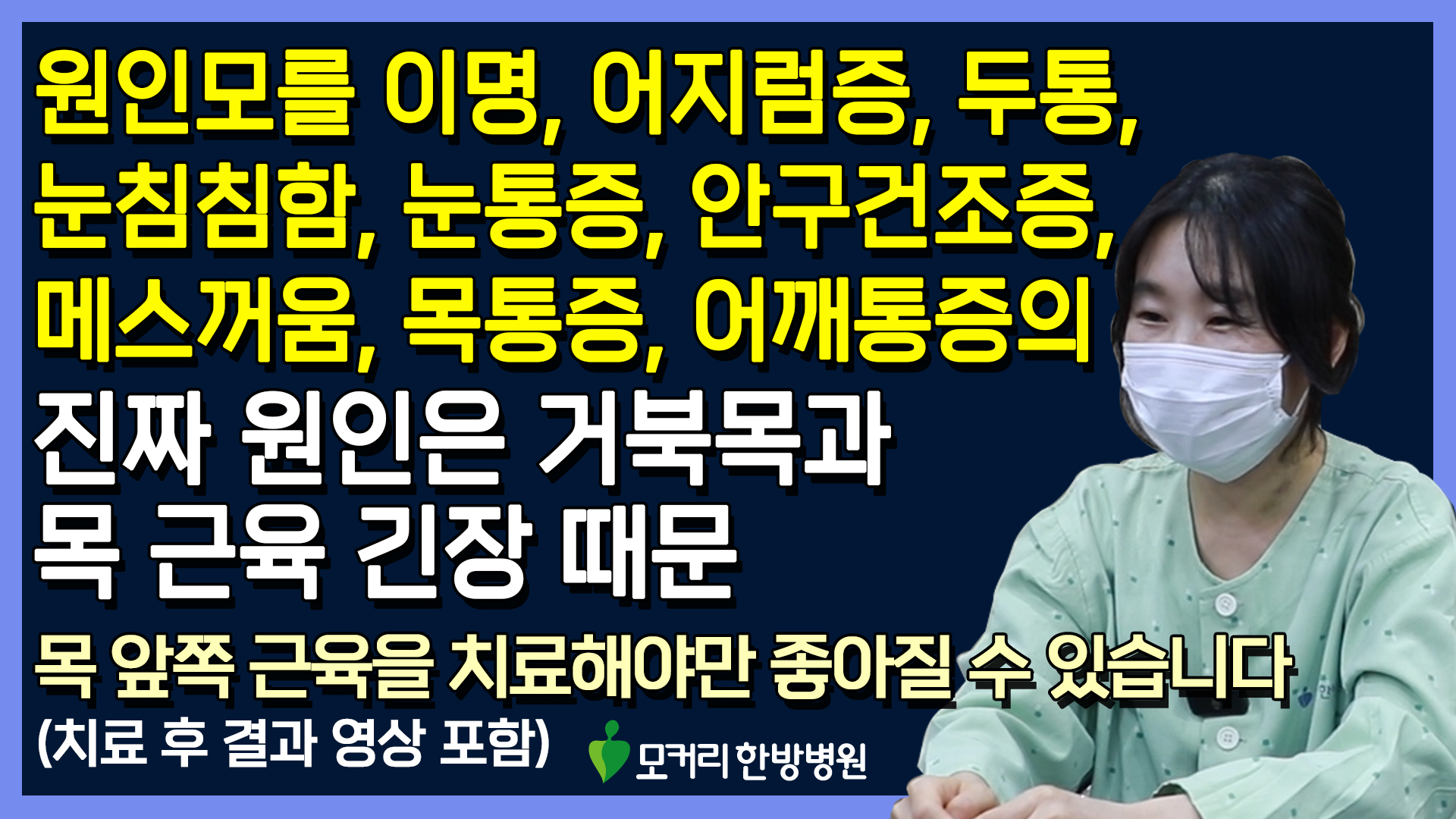 네이버에다가 ‘뭉친 목 근육 푸는 방법’ 이렇게 검색하니까 동영상이 하나 뜨더라고요. 그 동영상이 딱 모커리만 나오더라고요. 그래서 유튜브 들어가봤더니 치료후기도 있고 저랑 증상이 되게 비슷한 것 같아 가지고 그분들이 하는 얘기가 와 닿더라고요. 원인 모를 증상이라니까 딱 저 같았어요. 그분들도 똑같이 정형외과 갔다 오고 여기 병원 갔다가 저기 병원 갔다 하고 유튜브 보고 ‘아 이거를 전문적으로 치료하는 병원이 있구나’ 알았어요. 그래서 여기 오면 치료할 수 있겠다 싶어서 왔어요.