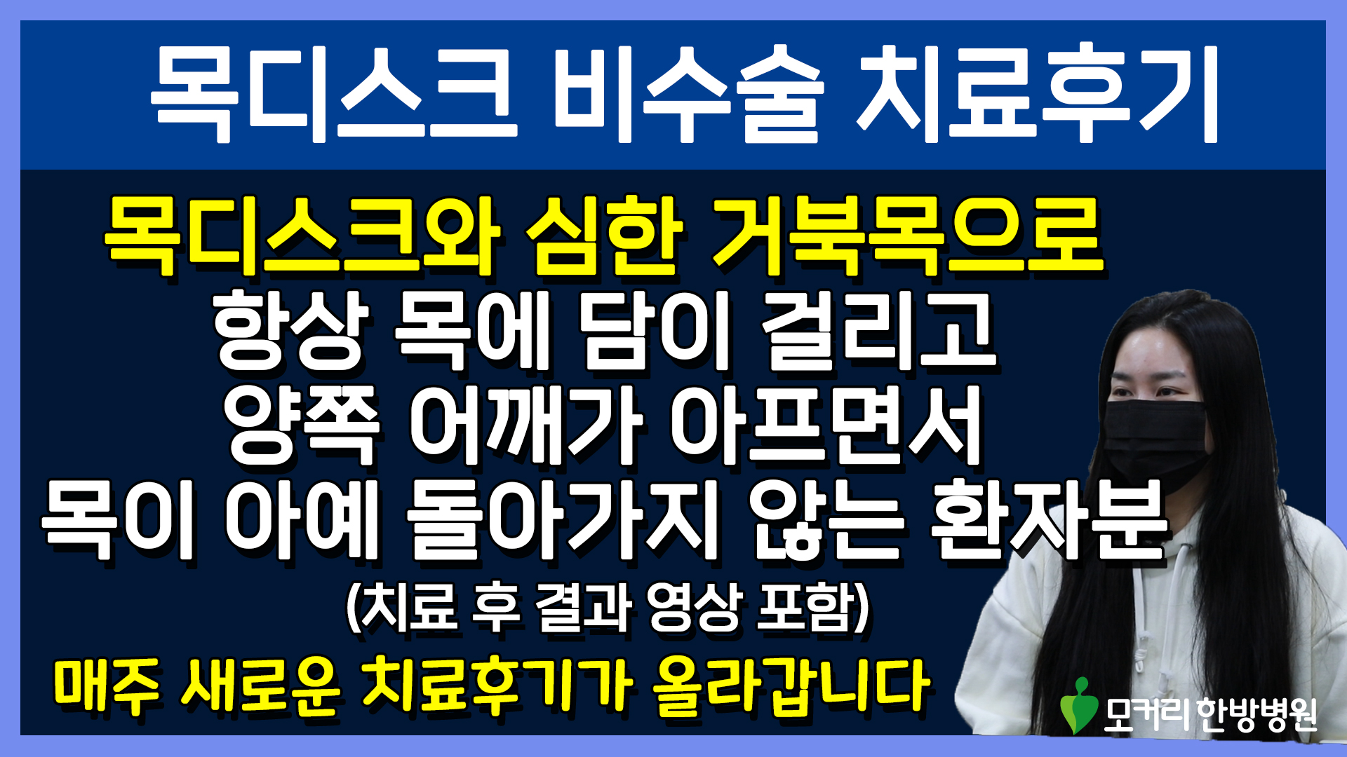 이렇게 설명 드렸는데도 아직도 목디스크 비수술치료가 가능하다는 걸 못 믿으신다면, 저희 모커리한방병원에서 올려놓은 수많은 목디스크 근육재활치료 후기를 꼭 보시길 바랍니다. 또 이런 생각하시는 분들도 있을 수 있습니다. 목디스크 경증 환자만 치료 가능한 것 아닌지 하고 말입니다. 저희 치료후기를 보시면 아시겠지만 마비와 힘 빠짐까지 있는 환자는 물론 무조건 수술해야 된다라고 들은 환자들도 많습니다. 또 수술 후에도 계속해서 통증에 시달리는 환자들 후기도 있습니다. 그럼 이분의 치료 결과는 어떻게 되었을까요? 이 환자분의 치료 결과가 궁금하시다면 아래 영상을 꼭 보시길 바랍니다.