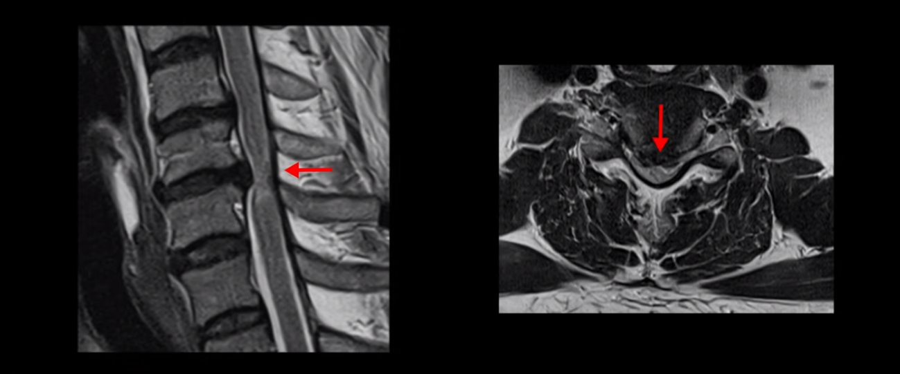 척수 신경이 눌려서 손상된 사인이 하얗게 보입니다. 이걸 경추척수증이라고 합니다.