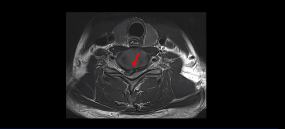 이분 목 MRI를 보면 6번, 7번 디스크에 매우 심한 디스크 파열이 있습니다.
